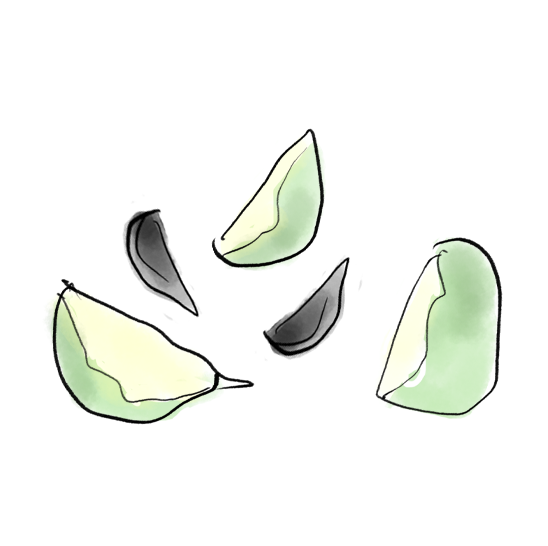 ソバのタネを手に取って観る機会はなかなかありませんが、外側には黒く固い殻、その内側に緑色の薄い皮(甘皮)、薄い皮の内側から出てくる胚乳部をギュっと押し潰すと、外側の層は大きく割れ、中心はモロっと崩れて白い粉が出てきます。