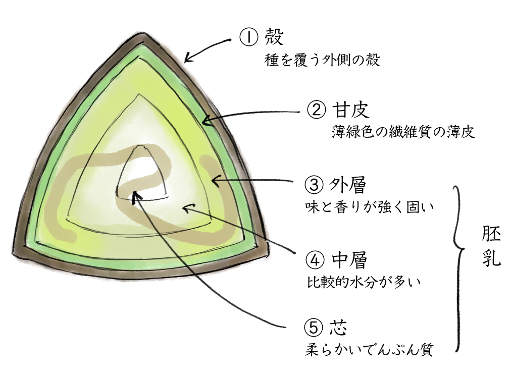殻・甘皮・胚乳・胚芽(子葉)が層になっていて、胚乳はさらに「外層」「中層」「芯」の3つの層に分かれています。