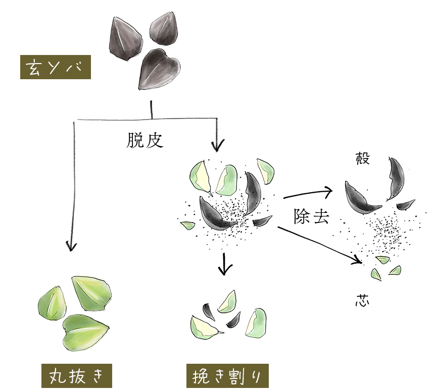 製粉前のソバの状態には、ソバのタネそのものの「玄ソバ」と、外側の黒く固い殻を剥いた「脱皮したもの」とあり、脱皮したものの中でも大まかに「丸抜き」と「挽き割り(挽き抜き)」があります。