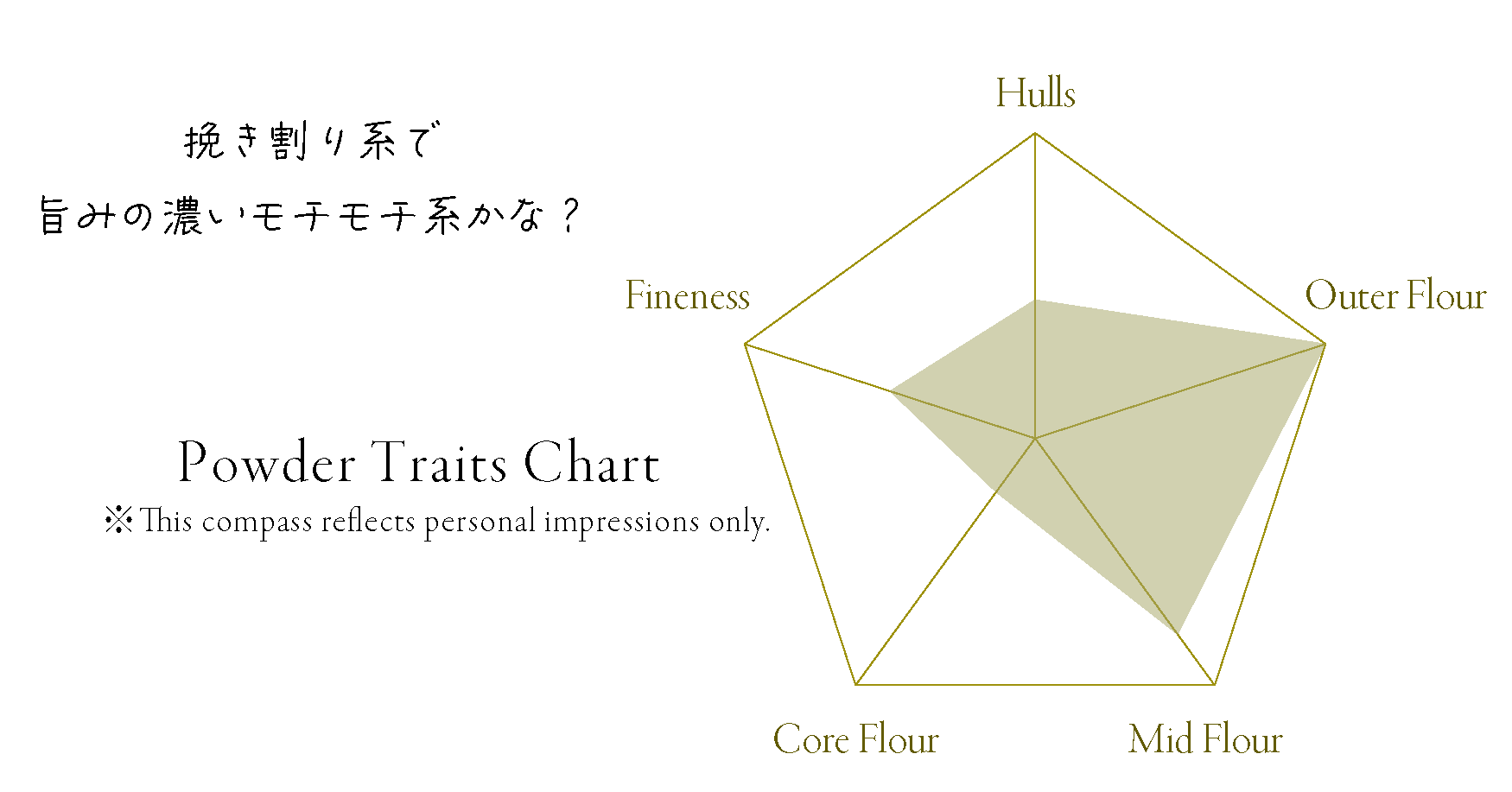 各ページに掲載する五角形チャート(ソバ粉の個性チャート)は、ソバの実に含まれる「殻」「外層」「内層」「芯」の割合と、「粉の粒度(メッシュ)」を可視化したものです。